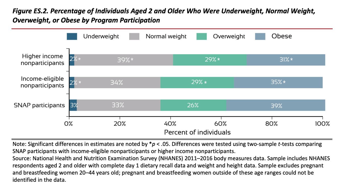 According to a 2021 study by the USDA, 39% of SNAP recipients are obese. Another 26% are considered overweight, 33% are considered normal weight, and a mere 3% are considered underweight. As shown in the table below, not only do these numbers closely mirror the breakdown for those who don’t participate in SNAP, but the obesity rate is actually higher for SNAP participants.